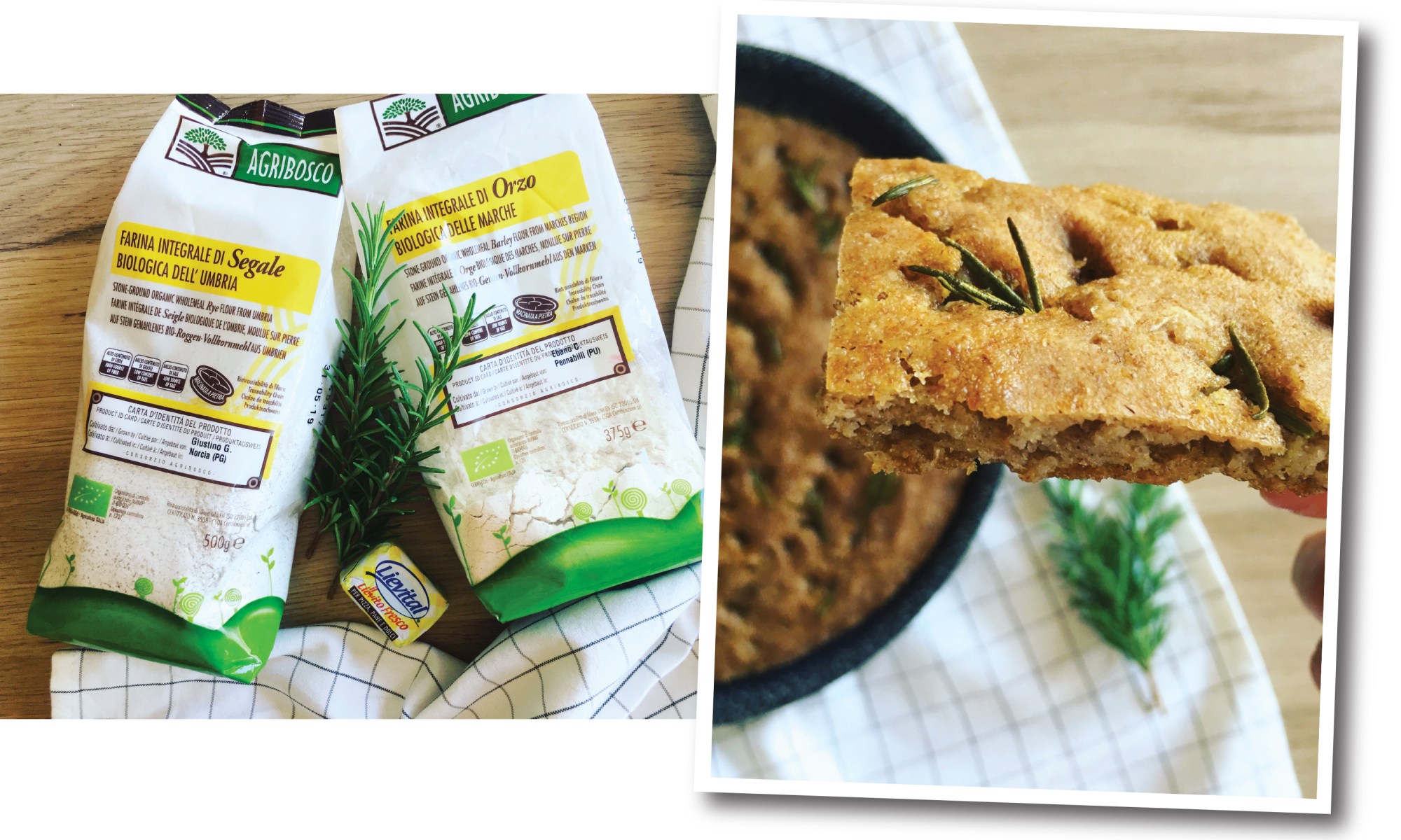 300 gr. di farina integrale di Segale; 200 gr. di farina integrale di Orzo; 1 cubetto di lievito fresco; olio EVO; un cucchiaino di zucchero; rosmarino; sale.