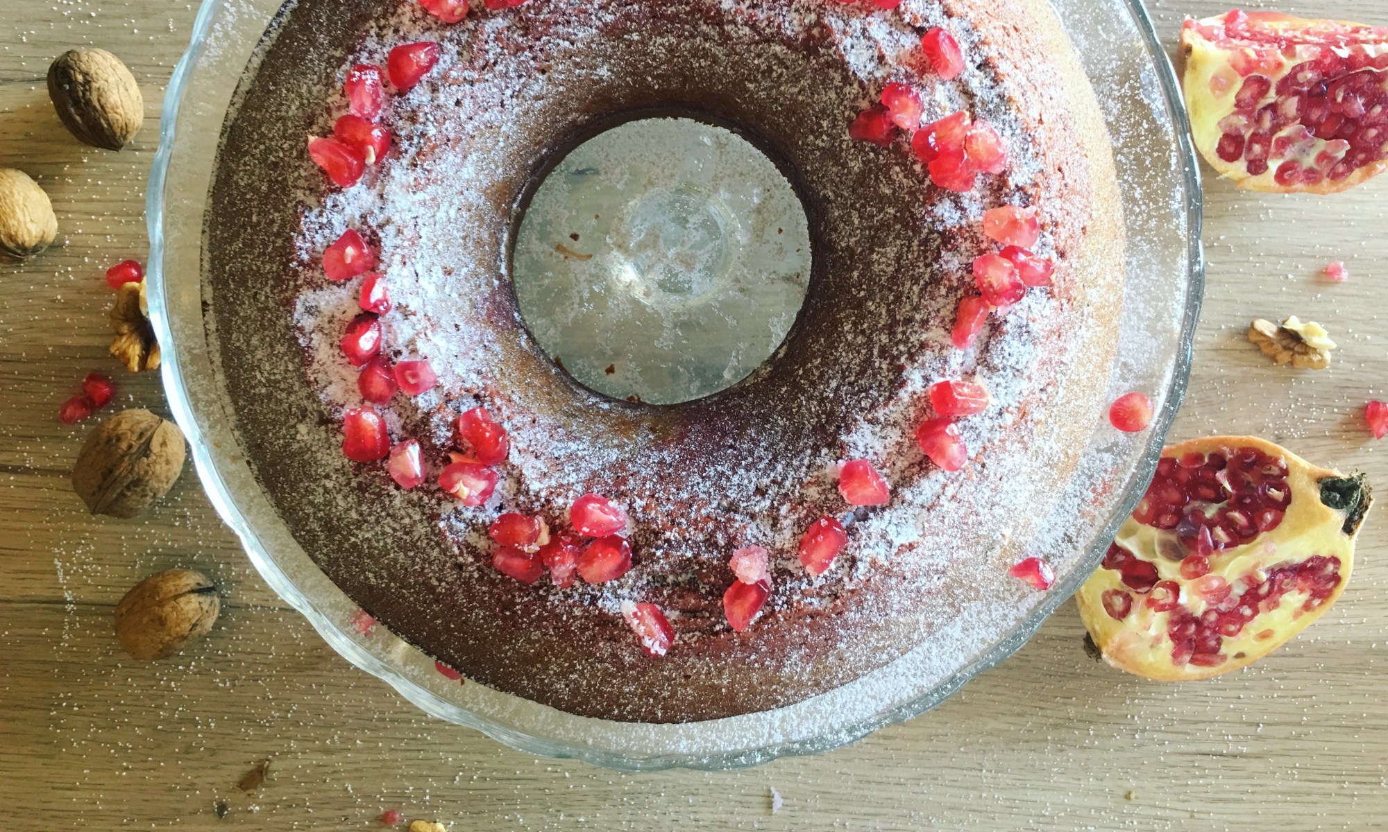 Accendete il forno a 180° funzione statico. Imburrate e infarine uno stampo circolare per ciambella; versate prima il composto con le noci, e dopo al centro, tutto intorno, l’impasto con il succo di melograno. Dunque infornate per 35/40 a 180°. Sfornate, e lasciate raffreddare.