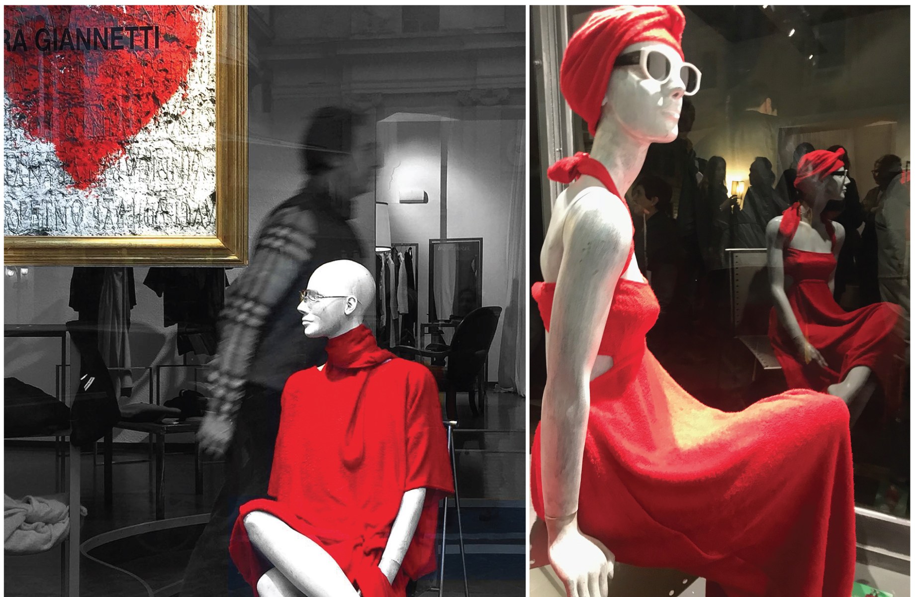 Così lentamente varcavo la soglia dello store, pensando al design di quelle forme destrutturate, e poi di nuovo al tempo trascorso, che in un lampo mi contagiò di vergogna, la faccia. Ma riconobbi lo stile della designer, marcatamente urbano, dai ravvisabili tocchi di nero, beige, bianco e infine rosso, protagonista della nuova capsule e del suo amore per l’arte, messo in vetrina con il cuore in un quadro di Gianpaolo Conti, e mi fece subito sentire all’altezza di scrutare dal vivo, per la seconda volta, quella particolare, semplice, visione di moda.