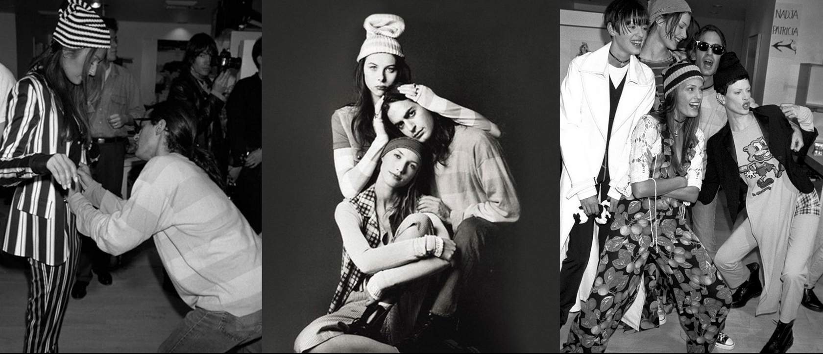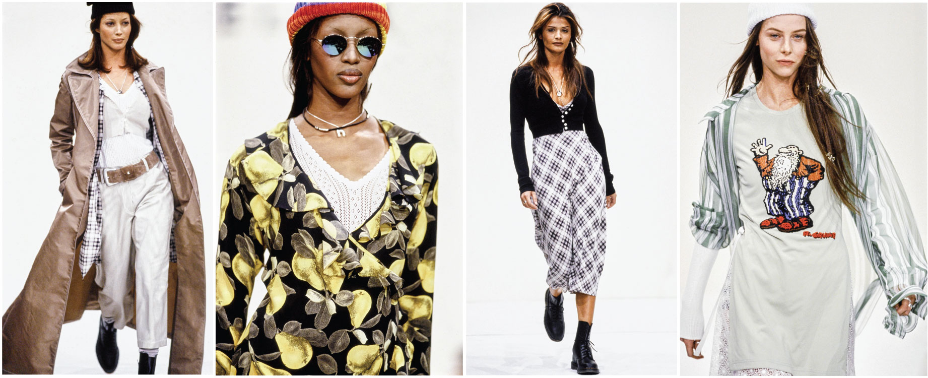 Sotto un’ipnotica compilation di rock alternativo, Naomi Campbell, Christy Turlington, Carla Bruni e Kate Moss, sfilano con un’aria trasandata, indossando camicie di flanella a quadrettoni, maxi abiti da nonna con stampe floreali e calzettoni a righe, portati dentro anfibi alti e neri.
