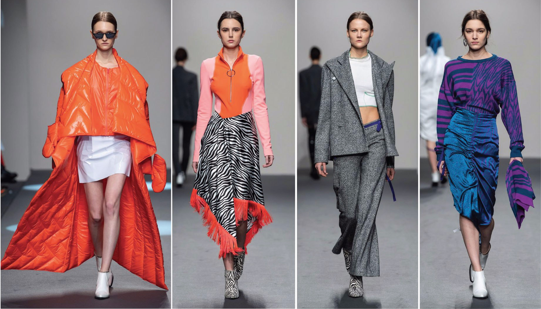 Così un piglio spiccatamente contemporaneo arriva a sfiorare la linearità classica urbana: giacche strutturate, abiti smoking, camicie maschili in simil jersey spalmato. Un insieme di materiali tecnici e blocchi di colore che oltre a ricordare gli anni 90 e la giacca da sci del suo papà, si mescolano a un mondo nomade, fatto di animalier, frange penzolanti e scialli da zingara intorno al collo, elementi che vestono di contemplazione quell’anima gipsy tanto cara alla giovane.