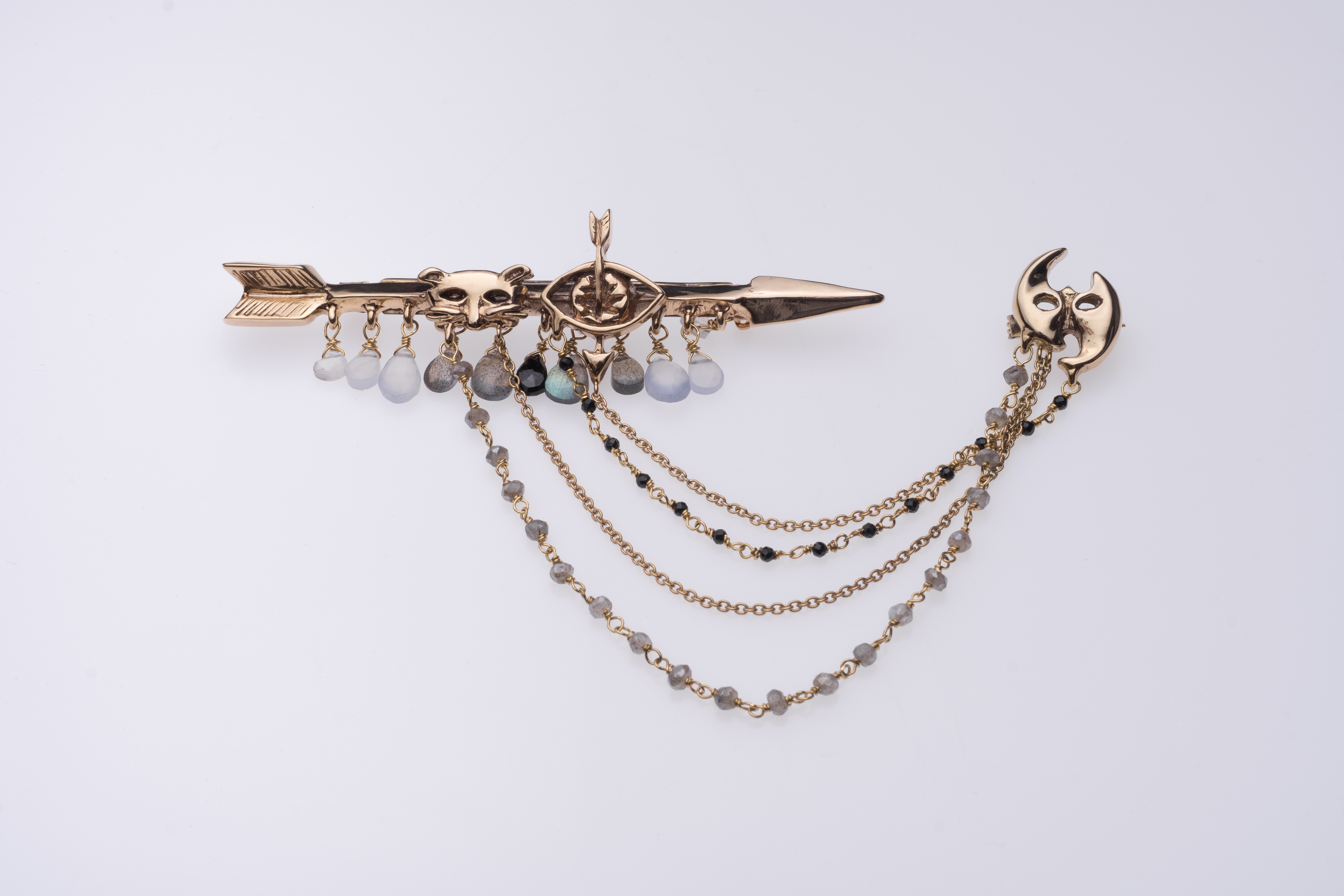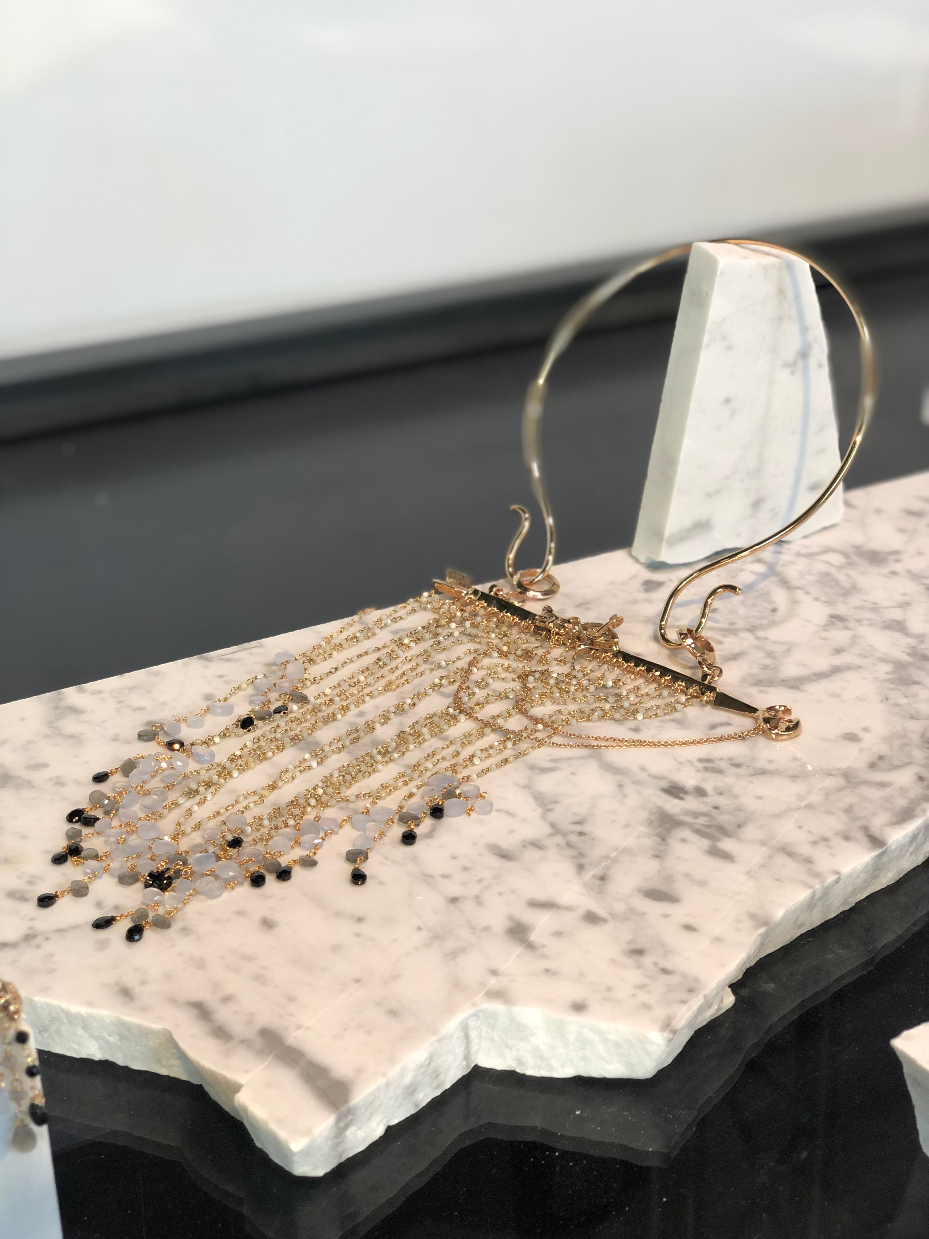 Un dispiego di bronzo laccato e pietre semipreziose – opali etiopi, spinelli neri, labradoriti e calcedoni – dove il tema è una storia vera. Una storia che racconta d’amore e usa le maschere, che a sua volta diventano anelli, orecchini, collane e spille.
