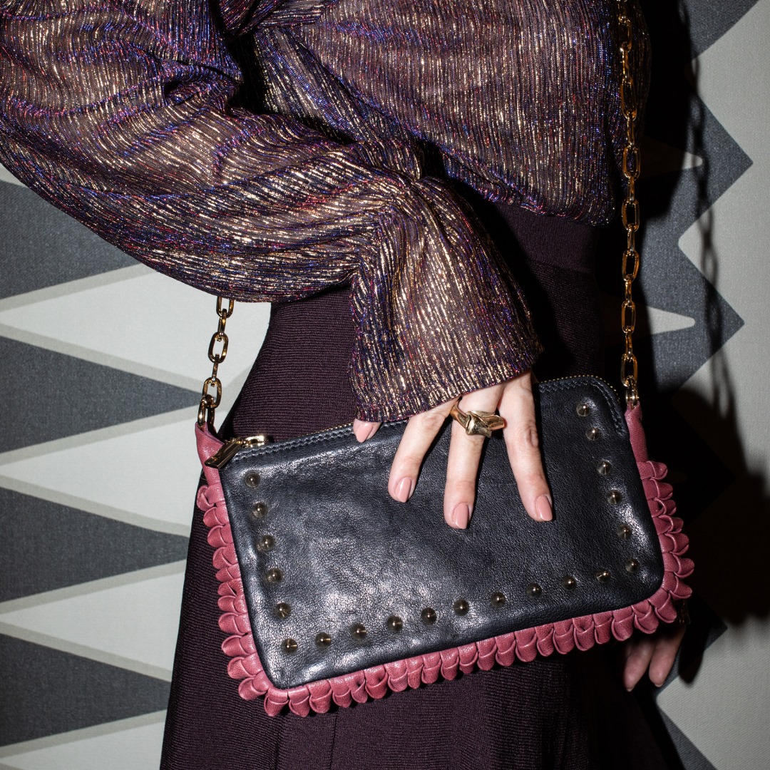 Una realtà concreta tradotta in morbide pochette “volutamente destrutturate” tiene a precisare la stilista. Contrasti di materiali differenti che messi insieme stranamente danno una specie di armonia: “Le mie borse, non sono le classiche rigide che stanno in piedi, sono sempre morbide, perché io punto sulla ricerca dei materiali e le chiusure, quindi la forma e la struttura non sono mai protagoniste” spiega la Venturi aprendo e ripiegando Adina, la maxi pochette realizzata in pellame double.
