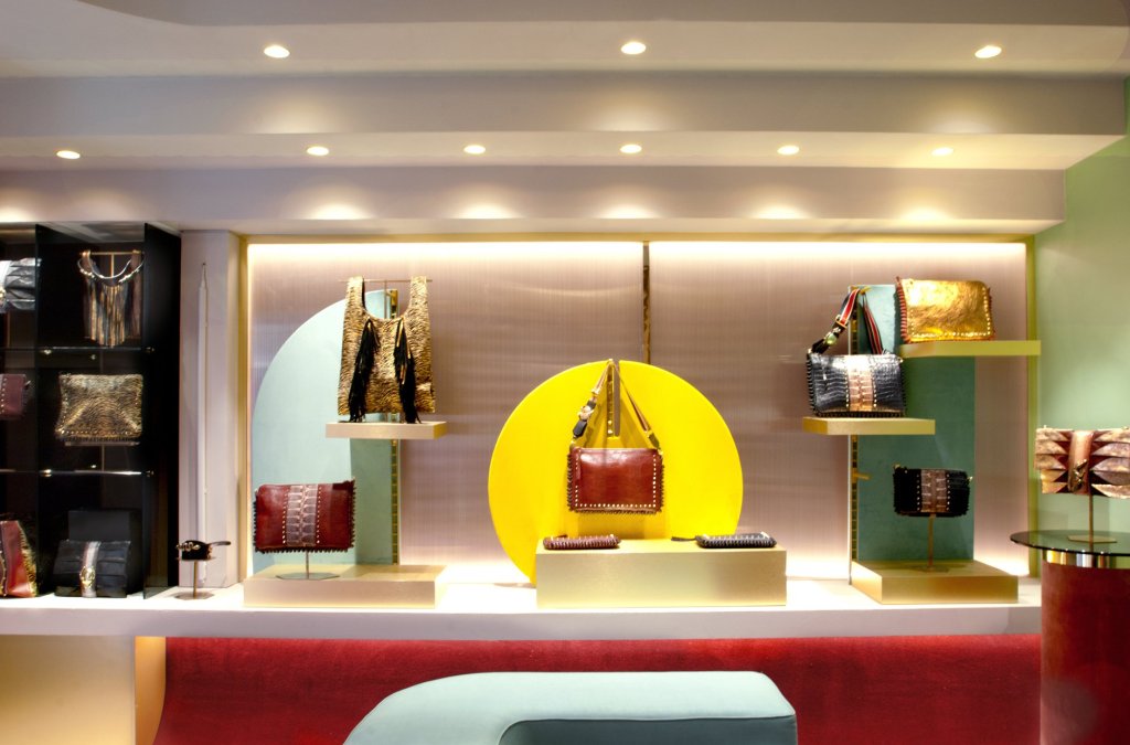 Osservando i pezzi, all’interno della boutique, sistemati sulla colorata serie di piedistalli, quel tocco etnico, quasi tribale aleggia protagonista: dalle geometrie con triangoli che sembrano punte di lance pronte a trafiggere, agli intriganti pattern maculati e muccati, fino ai dettagli 3D smaltati in oro e ottone brunito che riprendono serpenti, alligatori, scarabei e simpatici ranocchi.