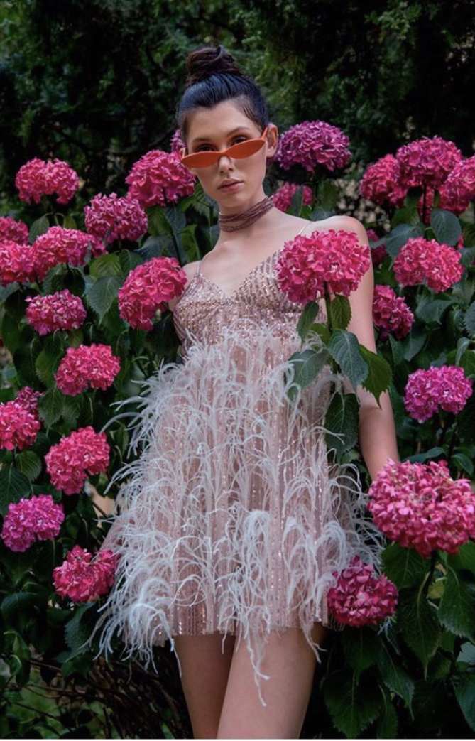 Così mentre fucsia e azzurro si orchestrano in uno zebrato all over su giacche sartoriali, mini abiti ed eleganti tute a zampa; d’altra parte rosso vermiglio, cipria e acquamarina colorano slipdress che diventano tela su cui dispiegare piume di stuzzo in stile flapper, e un numero indecifrato di paillettes e cristalli.