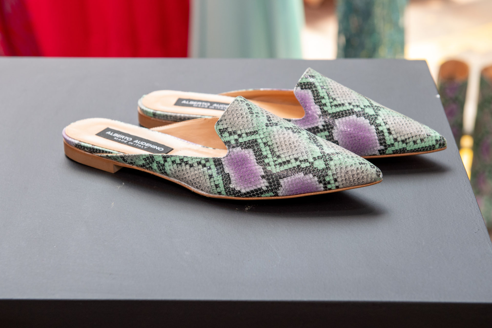 Ai piedi tacchi, tacchi e ancora tacchi, cruccio di Audenino: da alti e robusti a sostegno di stivali al ginocchio pitonati, a quelli più eccentrici dei tronchetti in total white; anche se all’improvviso, e solo per amore della mamma, in collezione fanno capolino un paio di slippers dedicate proprio a lei, che a differenza del designer non ama particolarmente indossarli.