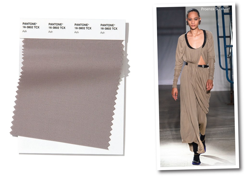 Ci sono designer che hanno costruito la loro carriera sul beige. Giorgio Armani, A.F. Vandervorst sono un classico esempio. Elegante e con un’aria di libertà, Ash cod. 16-3802 è un beige molto vicino al talpa. Neutro tendente al caldo, secondo Pantone trasmette un forte messaggio di longevità. Proenza Schouler s’ispira agli anni 80, e immagina una working girl moderna che non rinuncia alla sartorialità, ma trova il giusto compromesso per uno stile più versatile. Ecco il jersey di seta che magicamente diventa un abito drappeggiato dall’allure comfy chic.
