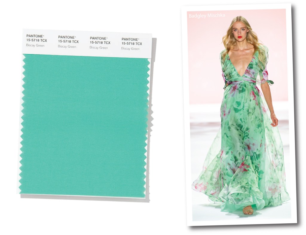 Come la maggior parte dei verdi, questo colore riporta ai toni della natura. Con un sottotono più freddo e meno acidulo rispetto al caro e vecchio Greenery (color of the year 2017), Biscay Green fa pensare ai tropici, anche se non serve andare poi tanto lontano. Il nome della sfumatura di Pantone, infatti, rievoca i toni cristallini delle acque che bagnano il golfo della Biscaglia (o Guascogna per la Francia). “Un’acqua purificatrice che rinfresca e rigenera”ha spiegato nei report Leatrice Eiseman. Da New York, Badgley Mischka propone un viaggio nel glamour più romantico, e mescola Biscay Green con altri toni di verde in una fresca ed elegante combinazione floreale.