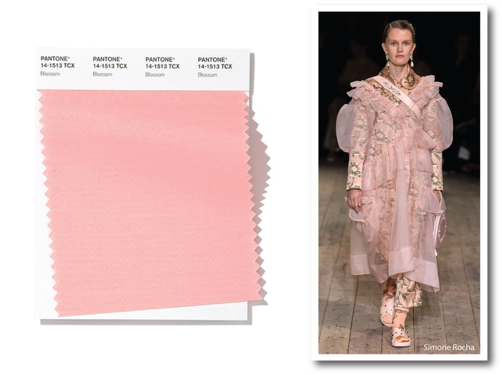 Blossom 14-1513 corrisponde a un delicato rosa caldo. Dai toni decisamente meno aranciati di Coral Pink, questa sfumatura zuccherina, ricorda lo scenico Pink Fluff Ball, l’abito che Sarah Burton – direttrice creativa di Alexander McQueen – realizzò nell’inverno 2012. Otto strati di chiffon finemente plissettato per incarnare una visione romantica e futuristica. Forse si potrebbe chiedere al rosa di uscire da schemi e cerimonie, e approdare in una sfera antropologica più stuzzicante. Uscire dagli schemi proprio come Simone Rocha, che per la SS20 parte dal folklore celtico e cattura nuove sagome: sovrapposizioni di organza e raso che lasciano al rosa, l’arduo compito di incuriosire e slacciarsi da scontati e polverosi dress code.