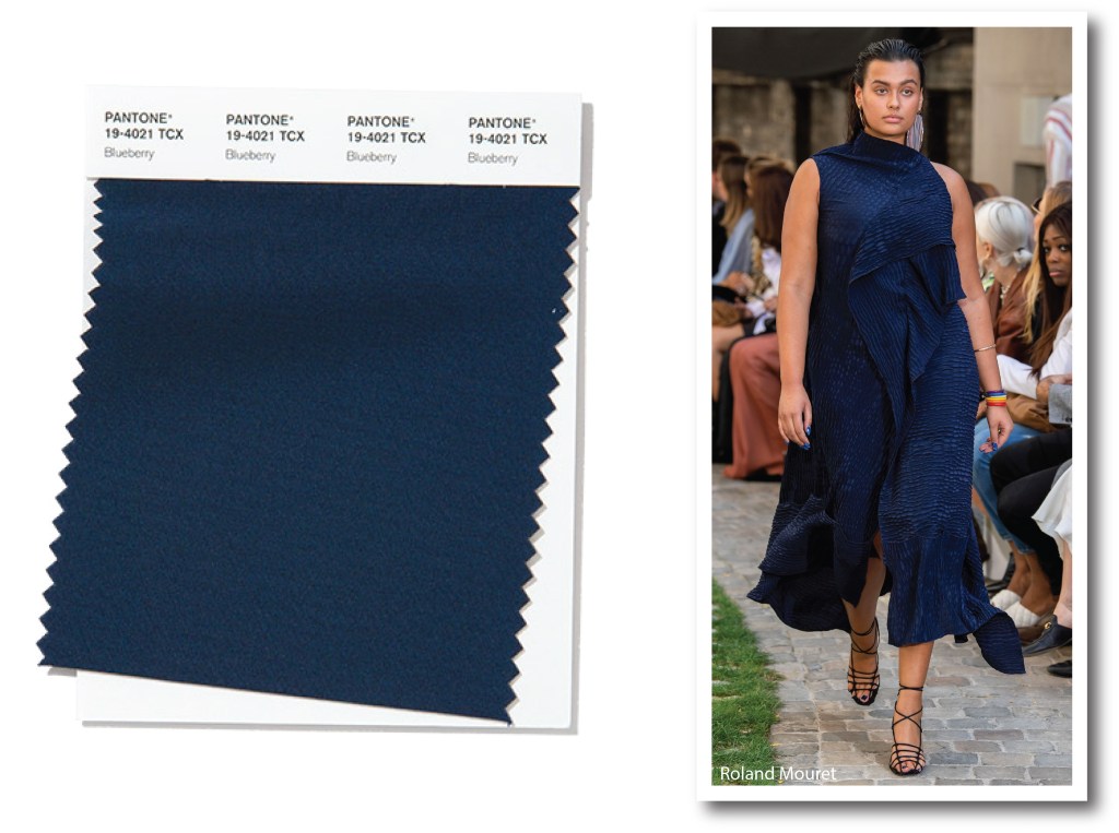 Ed ecco un’altra incursione nel food. Questa volta tocca al mirtillo, la pallina acidula e zuccherina, considerata da sempre un super cibo. Blueberry cod. 19-4021 è un blu freddo, con qualche punta lieve giallo verde. Seasonless, proprio come piace alla Eiseman, questo blu notte ha un’aria fiabesca e audace. Roland Mouret, sempre più attento alle tematiche ambientali, e al concetto di body positivity, si avvicina a silhouette morbide. Scivolando sui corpi con dolcezza gli abiti hanno un’allure rilassata e contemporanea.