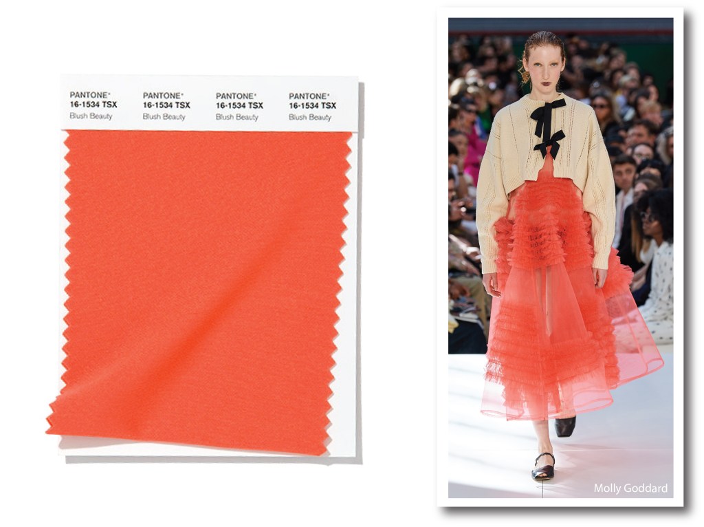 Blush Beauty ricorda il tipico rossore sulle guance: delicata reazione di coinvolgimento che avvolge e riscalda, quasi senza preavviso. Un arancio luminoso, preso in prestito dal mondo del make-up, leggermente più freddo rispetto ai classici arancioni di Pantone, Blush Beauty ispira a essere più ottimisti, spontanei e in perfetto equilibrio con la propria interiorità. La britannica Molly Goddard ne cattura l’impalpabile delicatezza, con la dirompenza di una vaporosa gonna in tulle, decorata da minuziose balze. Un gioco perfetto per giostrare l’animo impetuoso e reazionario di questa intrigante sfumatura.