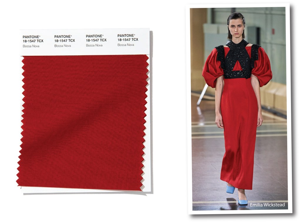 Il nome di questo rosso caldo e intenso fa pensare subito all’allegria, alla vita carioca, al Brasile. Bossa Nova, infatti, è un tipo di samba che nasce intorno agli anni 50, un genere musicale minimalista, a ritmo medio e con un incedere incalzante. Ma affibbiando il codice 18-1547, immediatamente Bossa Nova, acquista quel ruolo cromatico, pronto a concorrere per la carica di color of the year 2020. Infatti a pensarci bene a questo rosso terroso, non manca proprio nulla: carismatico, intrigante, nerbotuto. A Londra, Emilia Wickstead richiama uno stile vittoriano, morbido e imperioso. Bossa Nova si abbina al nero e al delicato Faded Denim, in un look dall’abito a tunica, con maniche a sbuffo iper volumizzate.