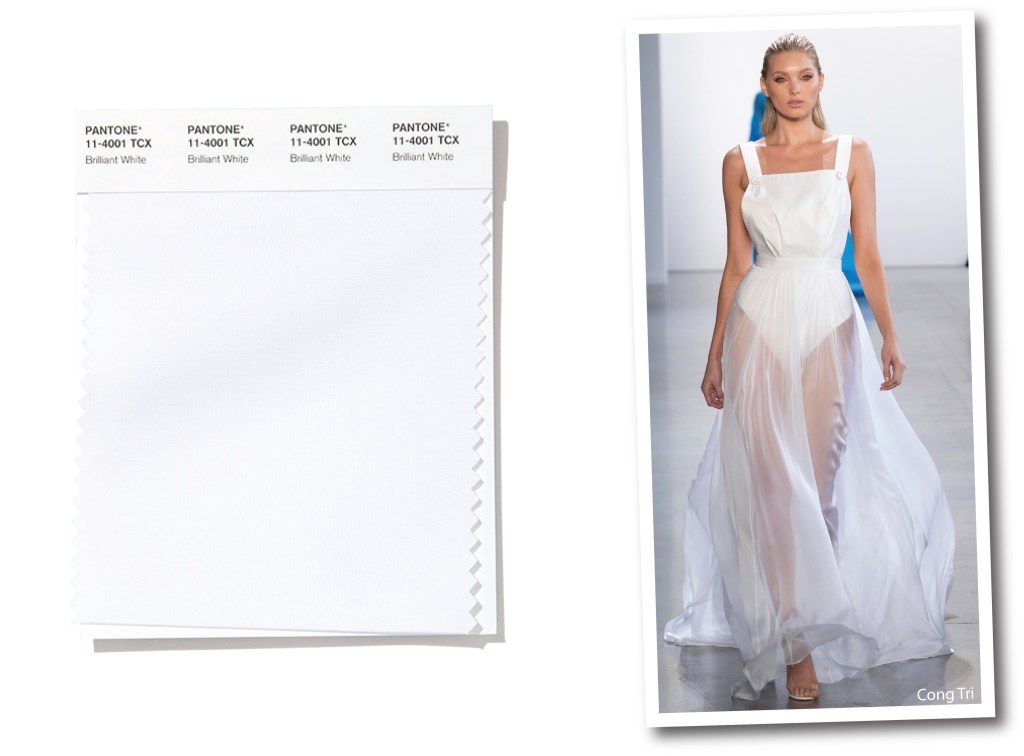 È un bianco super brillante quello rubato alle passerelle newyorkesi. Secondo Pantone si tratta di una sfumatura pulita, fresca e immacolata. Perfetta in estate, lo è altrettanto in inverno. Cong Tri mescola il raso e l’organza, e con un magico abito con body a grembiule, armeggia con le trasparenze e sul concetto di purezza e provocazione.