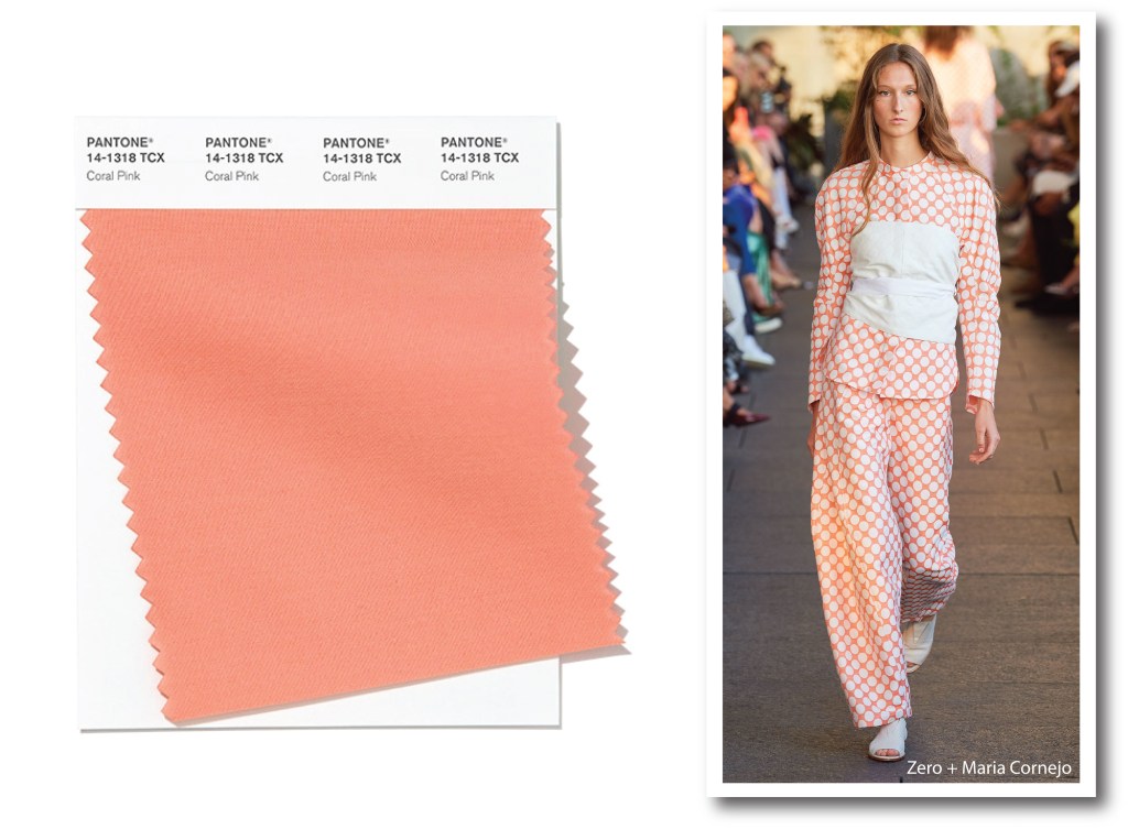 Ad una prima lettura, Coral Pink ricorda il mitico Living Coral. Dai toni caldi e zuccherosi, questa sfumatura rosa pesca potrebbe quasi considerarsi la versione pastello del colore (ancora per poco) in carica. Dalle passerelle newyorkesi, la serie tv Victoria ispira il brand Zero+Maria Cornejo. I corsetti vittoriani indossati sotto i vestiti, questa volta cingono con twist contemporaneo, completi in cui Coral Pink segue deliziosi pois optical. Scelta grafica perfetta, per equilibrare con eleganza e gentilezza un dressing down tipicamente street.