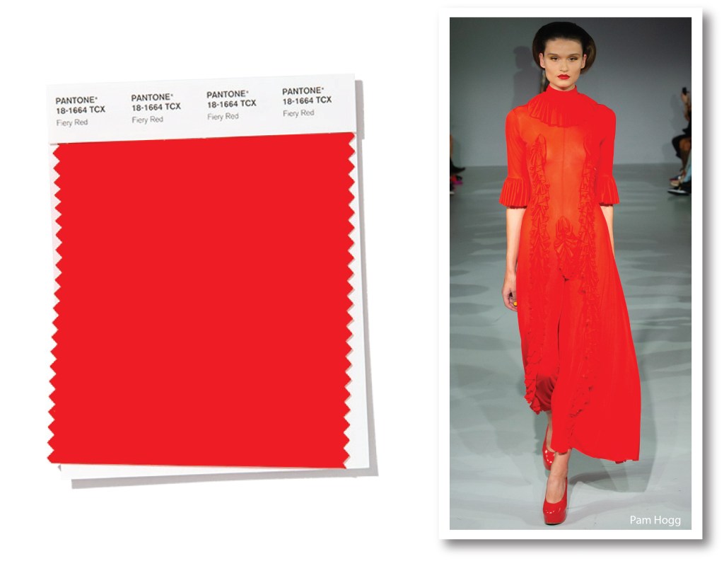 Tra i colori più peperini del globo, Fiery Red è il fiammeggiante rosso fuoco. Usato dai designer principalmente per il suo sex appeal, questo tono di rosso intenso e caldo non può che rappresentare la vita, la passione, l’amore. “Nel dubbio, vestitevi di rosso” sentenziava Bill Blass, stilista americano, soprannominato re della Settima Avenue. Stuzzicando l’adrenalina, Fiery Red è una scelta senza riserva alcuna: trasmette gioia e tanta energia produttiva. La stessa che la scozzese Pam Hogg cattura in un maxi dress seducente dallo stile ladylike, e dalle reminiscenze velatamente vittoriane.
