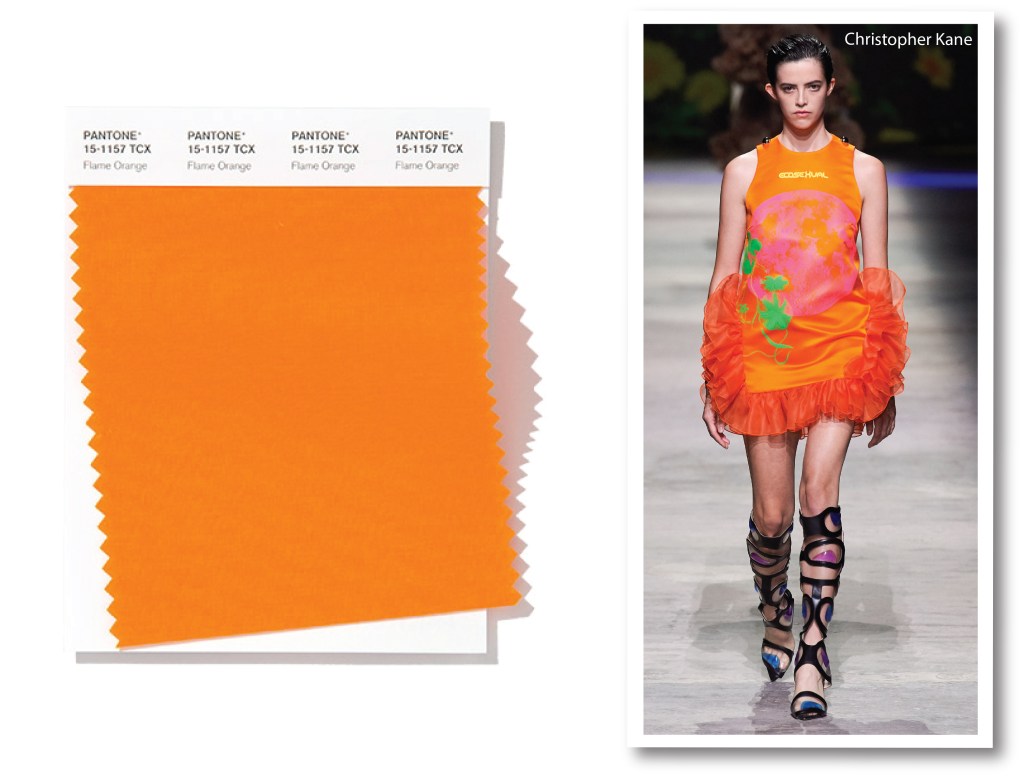 Leggermente meno saturo dell’arancione buccia d’arancia, Flame Orange – dall’inglese “fiamma arancio”-, trasmette calore e positività. Pagliuzze dorate al suo interno, rendono questa sfumatura dinamica e carismatica. Pronti per un effetto benefico su mente e corpo? Flame Orange, preso in prestito dall’industria alimentare, rievoca anche le striature incandescenti di un tramonto in inverno. Da Londra, Christoper Kane costruisce la sua visione contemporanea: su un mini dress a grembiule dai bordi schiumosi in tulle, ricama proiezioni della luna e fiori: un eco-decoro dall’anima fantasy che porta in serbo il dramma dell’attuale crisi ambientale, in una moda sospesa tra scienza e natura.