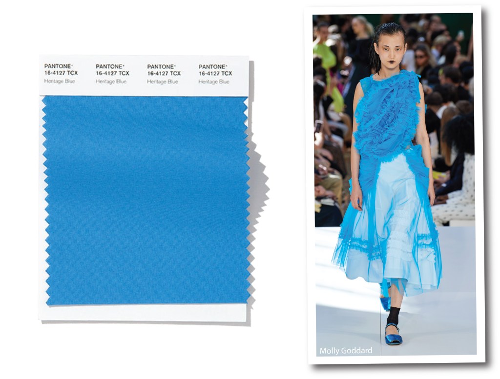 Una sfumatura prestigiosa, consapevole del proprio passato e delle proprie origini. Heritage Blue, è una versione più satura dello Sky Blue, e ha un sottotono leggermente caldo. A un primo colpo d’occhio si prova una sensazione avvolgente, anche se è facile pensare all’abito svolazzante di Carrie, lo stesso che nel film, indossa per festeggiare il suo appartamento appena ristrutturato. Heritage Blue è un colore custode, senza tempo, pronto a ispirare i millenials e le generazioni future. Dopo Blush Beauty, Molly Goddard da Londra lo utilizza per metri di tulle, giostrando il suo dirompente romanticismo.