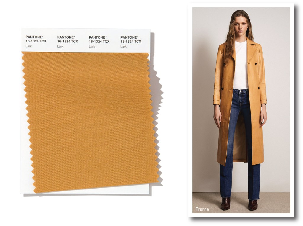 Il color allodola (trad. dall’inglese) è vicino al classico color khaki. Un tono di giallo senape, molto chiaro e naturale. Si chiama Lark e prende il nome dall’ornitologia. Dall’allure boho chic, Pantone ha scelto questa sfumatura perché “autentica e modesta, versatile e sobria”. Frame esce dalle passerelle, e con soluzioni sempre meno impattanti, presenta un ready to wear casual e di tendenza: il trench in ecopelle ha un taglio classico, senza tempo e con il giusto tocco bohèmien.