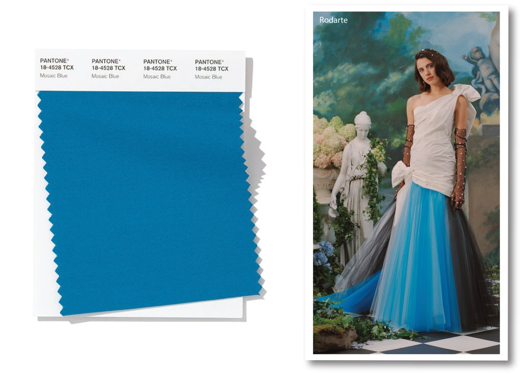 Mosaic Blue è un colore spirituale. Più denso di Heritage Blue, una lieve punta di giallo riscalda il suo sottotono. Si direbbe una sfumatura dall’aria mistica, e secondo Leatrice Eiseman emana grazia, fino a sfiorare le corde dei sentimenti più reconditi. Versatile e attraente, Mosaic Blue fa pensare ai pattern mosaici dei templi orientali. E fuori dalle passerelle, in un magico ambiente surreale, sospeso tra l’arte classica e Alice nel paese delle meraviglie, Rodarte utilizza il candidato di Pantone. In una vaporosa altalena di contrasti, l’abito da gran soirée ha un’anima rock e ricercata. Una combinazione davvero intrigante, soprattutto per la Gen Z.