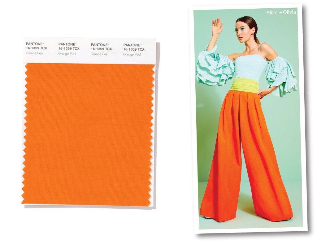 Nel 1984 Jean Paul Gaultier presentò l’iconico abito corsetto con coppe a cono, introducendo l’estetica queer. Il colore era proprio Orange Peel, scelto per dare una carica erotica e femminile al capo. Dall’impriting salutista, l’arancione buccia d’arancia è caldo e vivificante: un tocco agrumato e piccante che spicca nel fashion system. La stessa Stacey Bendet di Alice+Olivia per la SS20, usa Orange Peel. La sfumatura si combina con Yellow Iris e Biscay Green, e in una visione esuberante su un maxi pantalone palazzo, mantiene intatta la sua energia vitaminica.