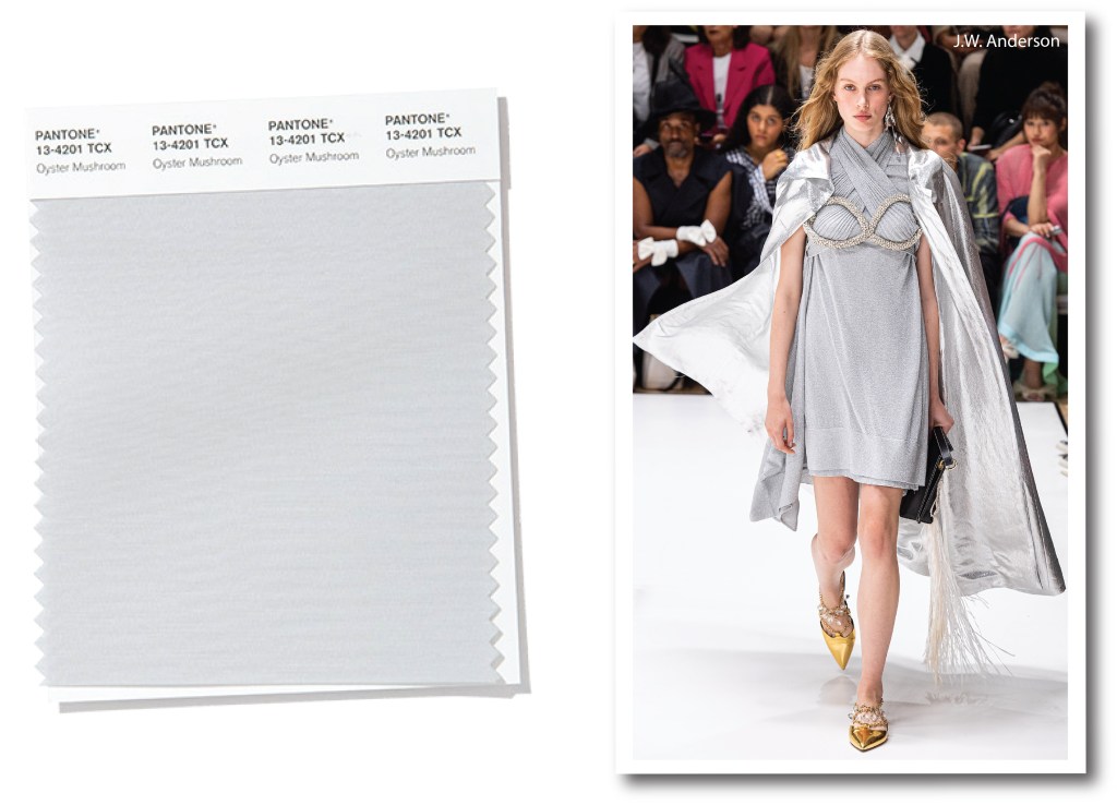 Conosciuto sulle nostre tavole come pleurotos (o comunemente orecchione), questo tipo di fungo è detto anche Oyster Mushroom, ossia fungo ostrica. Pantone si è ispirato proprio alle sue sfumature per questo grigio perla, elegante e sfaccettato. Lo stilista britannico J.W.Anderson predilige una versione lamé, e non disdegna neanche il color oro. Immagina una dea futurista con abiti drappeggiati sovrapposti a reggiseni gioiello, e mantelli comodamente adagiati sulle spalle che sembrano rubati a un film di fantascienza.