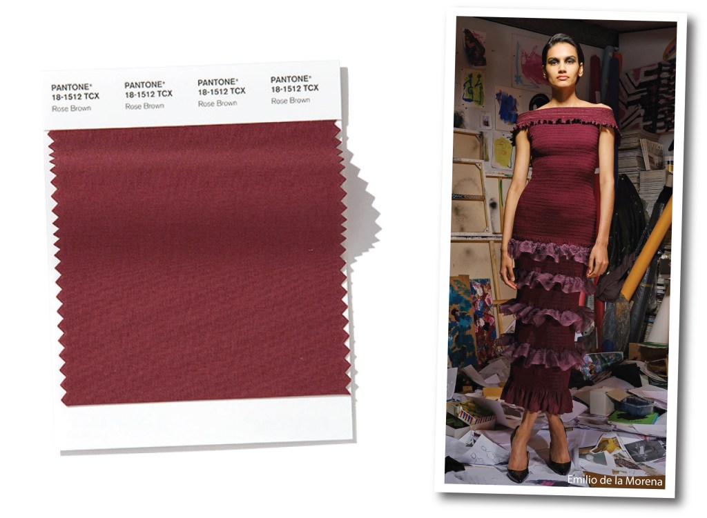 Un marrone sfaccettato e intenso. Fa pensare al foliage autunnale, e a simmetrici quadrotti di cioccolato al latte. Rose Brown trasmette forza e sostanza perché ricorda i colori legati alla terra, ma allo stesso tempo è addolcito da flebili e sofisticate note rosate, che lo illuminano e lo avvicinano ai toni del borgogna. Sulle passerelle di Londra, Emilio de la Morena, rende più saturi i tramonti andalusi, e usa un’ampia tavolozza per vestire con femminilità e incanto la donna moderna. Tra le proposte, un abito senza spalline in jersey, striato da una serie di romantici volant in pizzo.