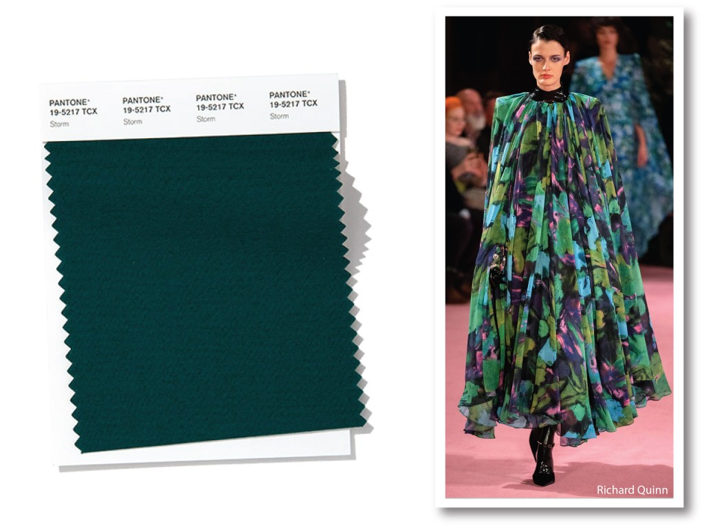 Se l’aromatico Chive, è il verde selezionato nei report di New York, l’ammaliante Storm invece, più scuro e profondo è la versione british. Qualche pigmento in più di blu, rende questo verde tempesta, una sfumatura sontuosa, molto vicina al Deep Lake, colore che A.F. Vandervorst utilizzò nel 2012, su un abito da ballo dallo stile androgino, ricavato da una non-proprio-semplice cappa a gilet. Storm, nonostante l’animo burrascoso, è dunque un colore che ammalia: sempre partendo da una cappa il visionario Richard Quinn, in una proposta SS20 sfida a ripescarlo nel suo intrigante pattern floreale.