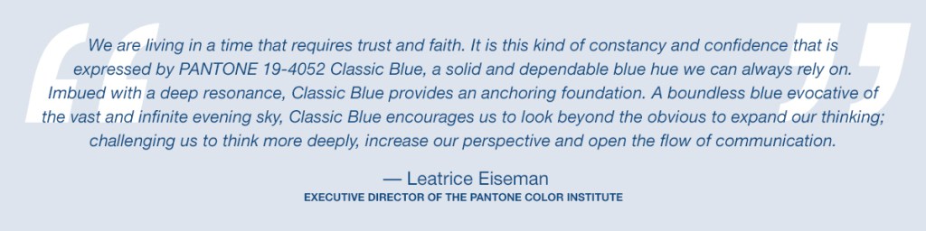 “Viviamo in un’epoca che richiede fiducia e speranza” ha annunciato Leatrice Eiseman nel comunicato ufficiale. “Classic Blue è una tonalità di blu stabile, sulla quale possiamo sempre fare affidamento… Dotato di profonda risonanza, esso costituisce una solida base a cui ancorarsi”. Affascinante conduttore di legami, combinandosi con i toni energici della palette, regala un cocktail di ottimismo ed energia, e come una mano tesa solleva con fiducia, assecondando quel prezioso desiderio di stabilità e creatività.