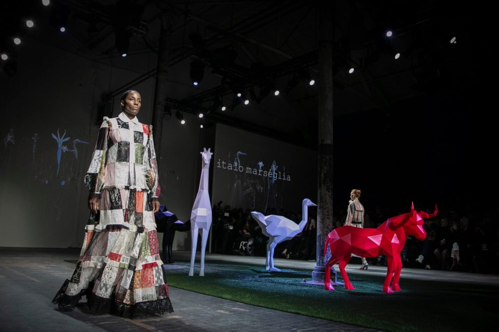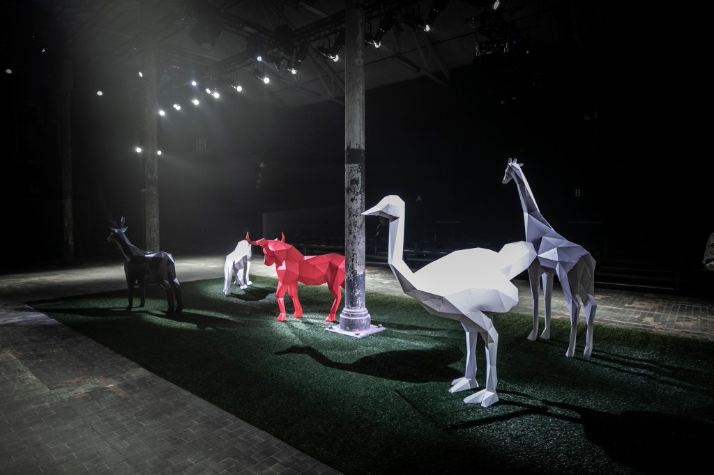 Risultato? Una scaletta musicale condita di dramma, estetica fanciullesca e rumori della giungla. Giochi onomatopeici, facenti eco a una savana improvvisata al centro della passerella, con riproduzioni plastiche di struzzi, giraffe, leoni e gnu.