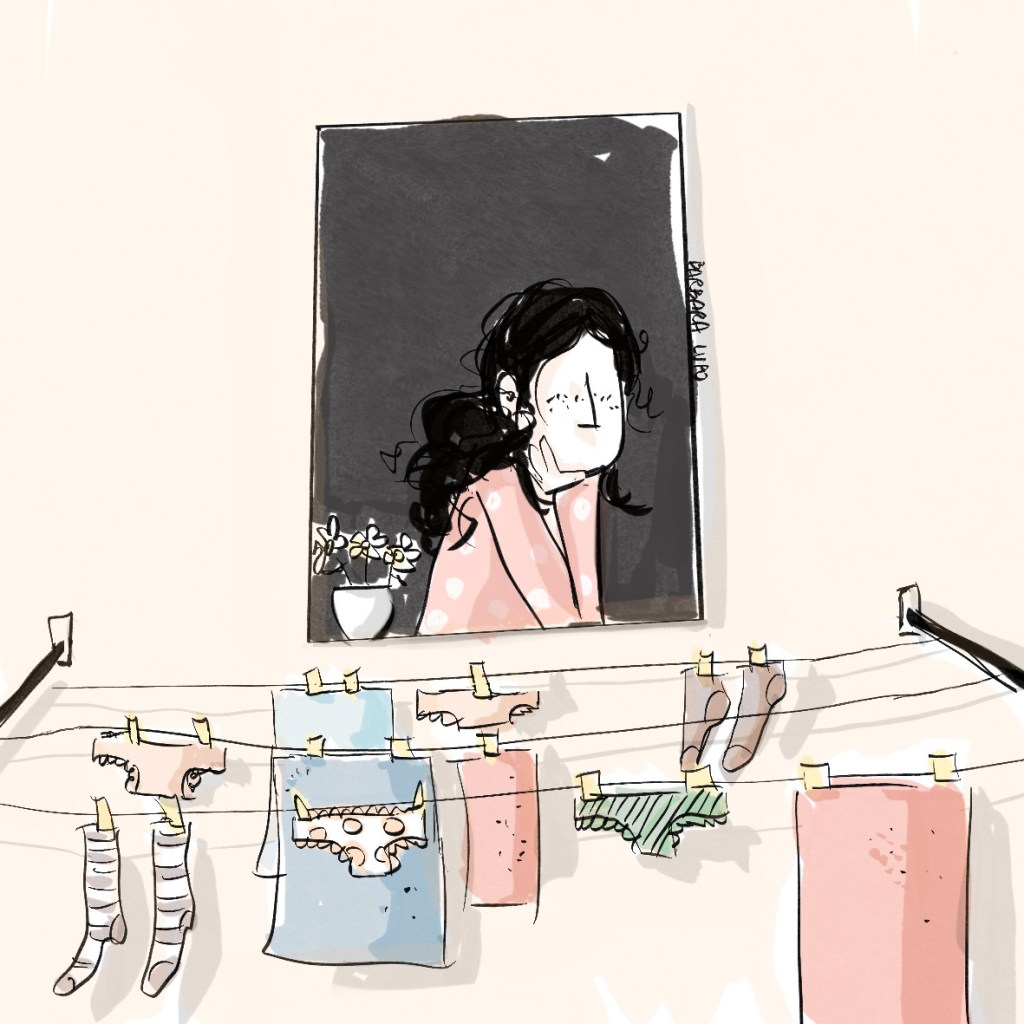 Il massimo della leggerezza arriva poi dallo stendino, quando il Lenor profumazione vaniglia dal bucato si sprigiona nel mio naso, e per un momento rallento il tetris. Trovo posto all’ultima canottiera, ma vorrei qualcos’altro da appendere, per saperne di più, sentirne di più, trattenermi con una scusa, e capire il nocciolo di quella maleducata questione che in quel momento insieme a tutto il resto sembra illudermi e distrarmi in beata normalità.